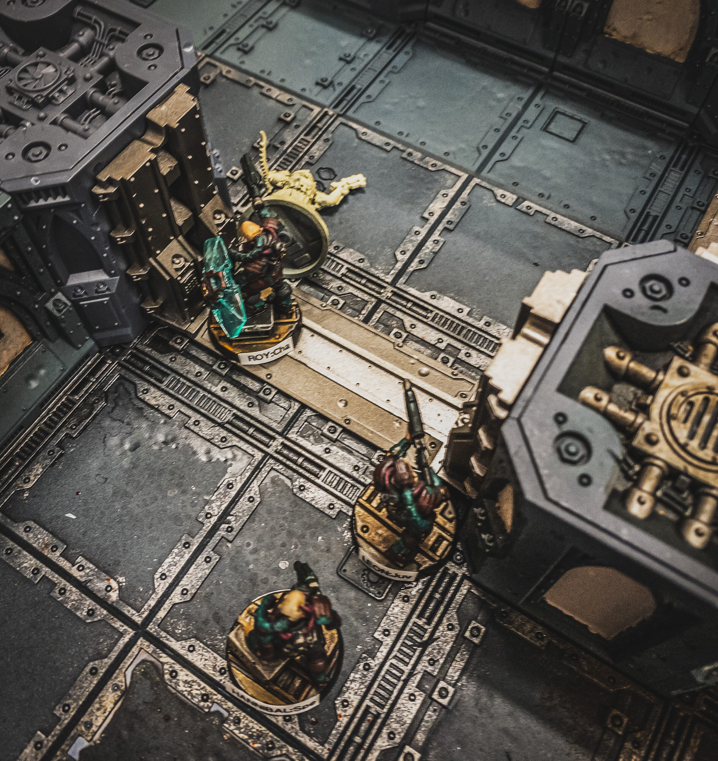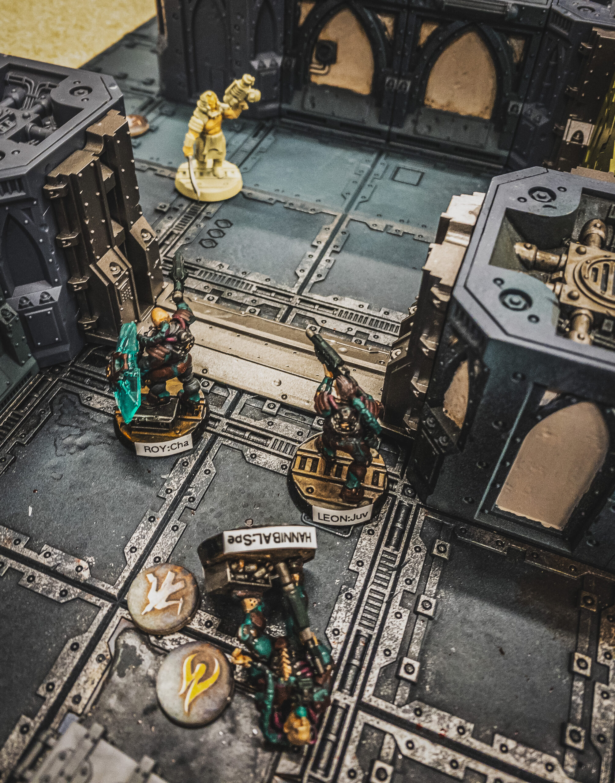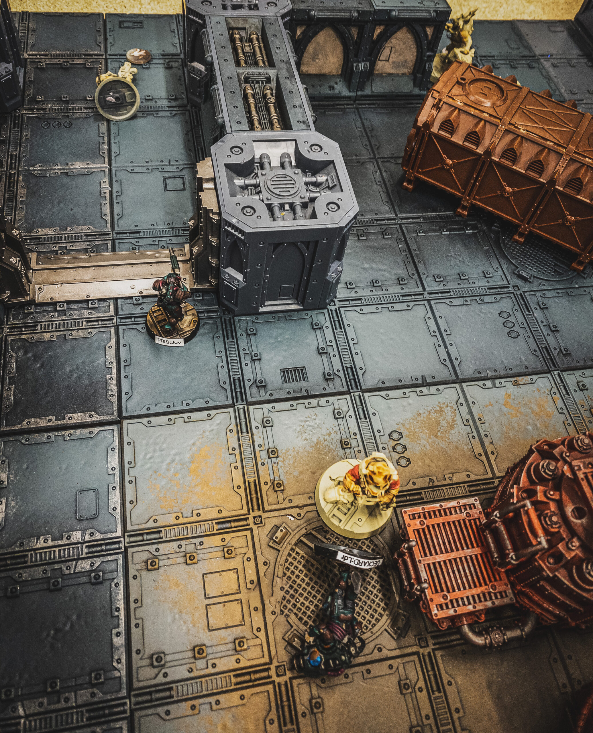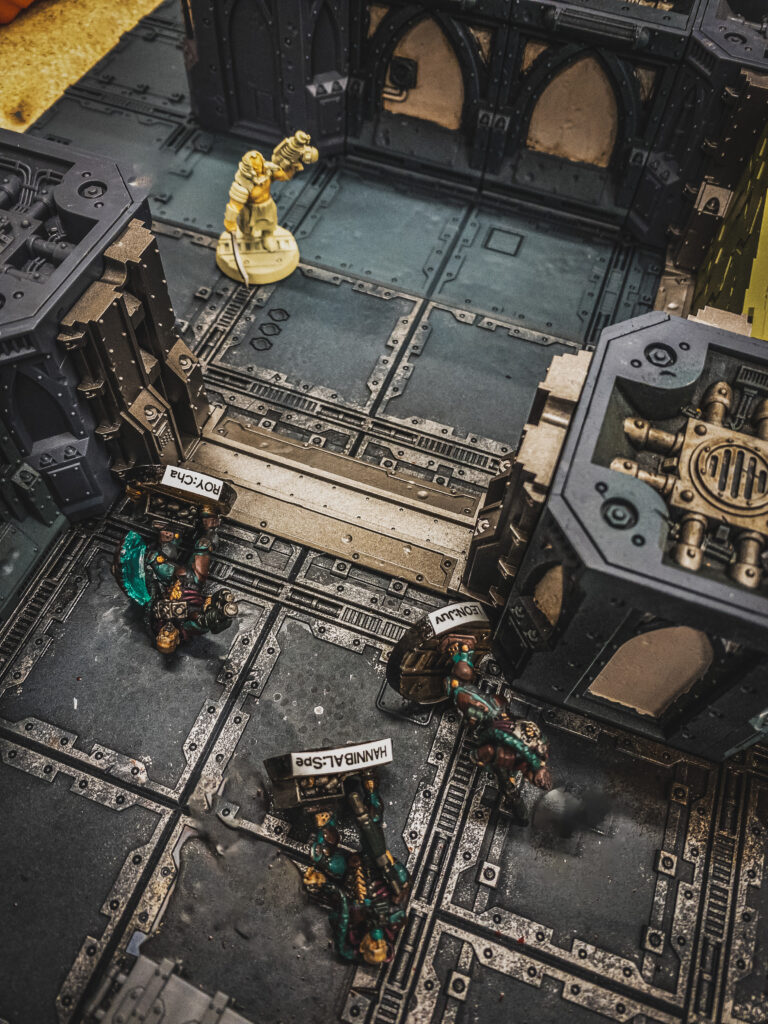Meanwhile Deckard, the Van Saar leader, took another Juve, Pris, on a central path to try to guard from a flanking manoeuvre while creating a kill box if a leftwards pointing door could be opened.ย  Eager to impress the boss, Pris reached and opened the door, but also instinctively caught a skulking Corpse on the other side with a lasgun shot.ย  Distracted by her good work, Deckard had no time to react to a turbocharged run from a Grinder armed with a fearsome rotary flensing saw, tackling him from his right, wrapping the saw round his back causing a grievous spinal wound with a deft pulling motion.