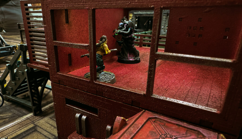 The delaque scattered with the Flanking forces racing forward, the Nacht Ghul attempting to locate the hidden shooters. Bursting from Cover Zohra stumbled under the sights of the Escher plasma gunner. While the shot missed by the narrowest margin, the explosion as the rockcrete exploded on the wall behind her floored the incautious delaque who promptly turned tail and scurried back for cover. As the firefight continued between the man in the high spire and the Escher Matriarch the Escher dashed forward to a better vantage point., right within reach of the claw wielding Nacht Ghul hidden below, seizing the opportunity Deus Irae scrambled up the building and engaged the Escher in the building one after the other in an orgy of violence, the blood of Wendy and Alanis on his claws, their injured forms lying silent behind him.