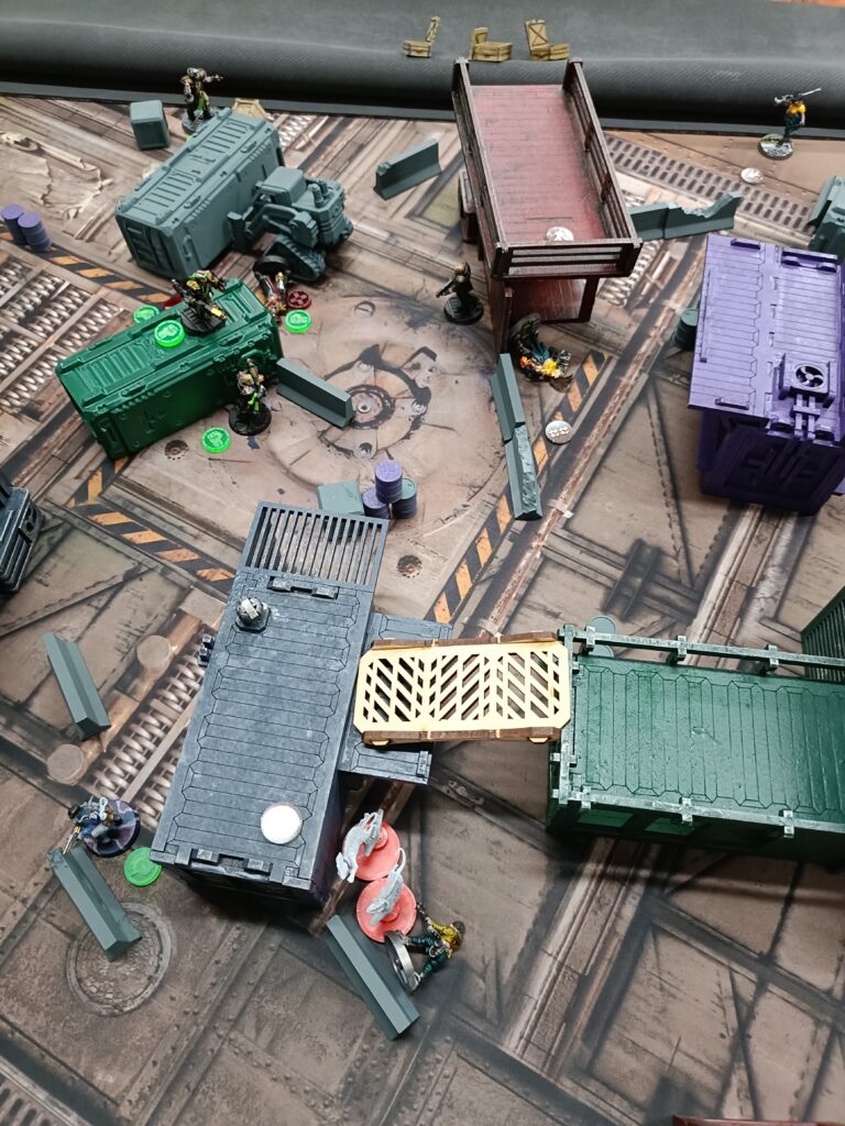 Suddenly the factory was awash with noise as Ms Blue jumped out of the window with her feral cat like beasts to face down the attackers and Lobotomia broke free of cover to engage Sergeant BooBoo. Her claws and toxins making light work of his armour.